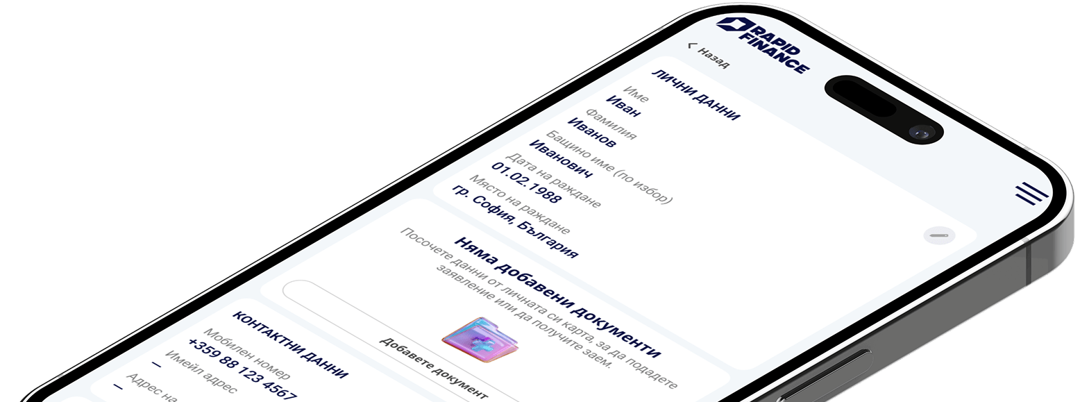 Регистрацията и входът са обединени – достатъчно е да въведете телефонния си номер, да получите SMS код и веднага ще влезете в личния си профил. Ако вече сте подавали заявка или сте използвали нашите услуги, системата ще ви разпознае. В личния профил можете да следите заявленията си, да подписвате документи и да управлявате заемите си.